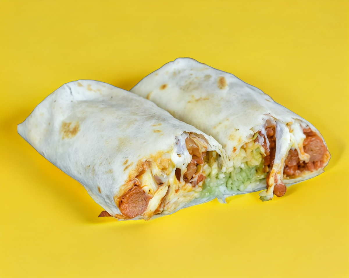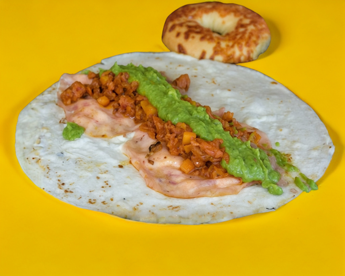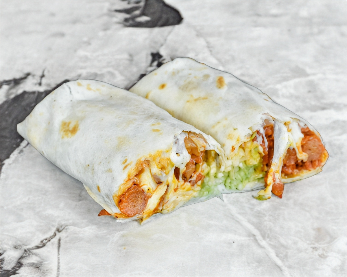 Tortilla de harina con salchicha y queso Oaxaca, crema, queso y guacamole.