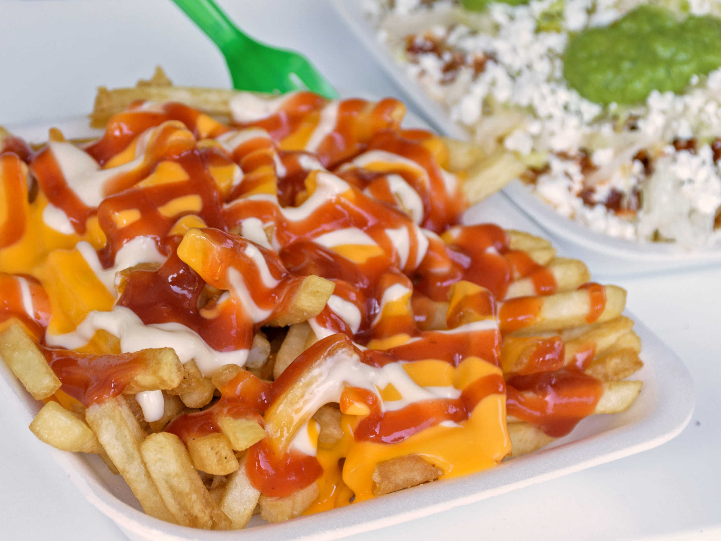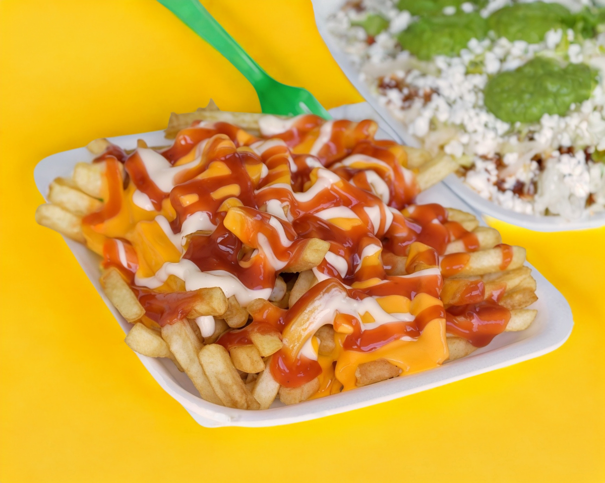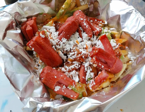 Papas, salchicha, crema, frijoles, queso amarillo, tinga y queso rayado.