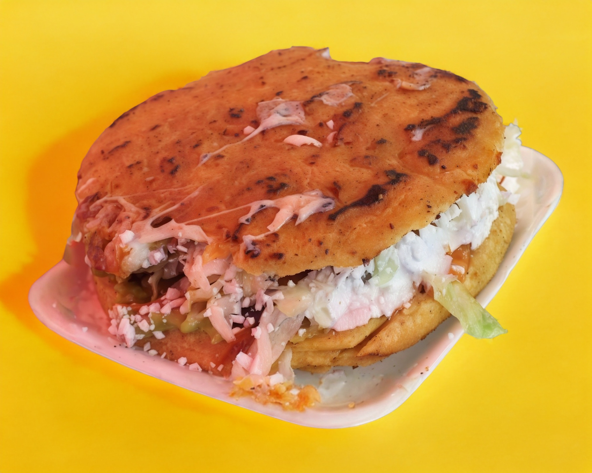Tortilla de harina, jamón, queso manchego, lechuga, jitomate, cátsup y carne de hamburguesa.
