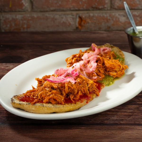 Una base de masa de maíz rellena de frijol, acompañado con la jugosidad del cerdo pibil de 200 g y cebolla morada, junto con tu salsa preferida, escoge entre verde, roja o campechana