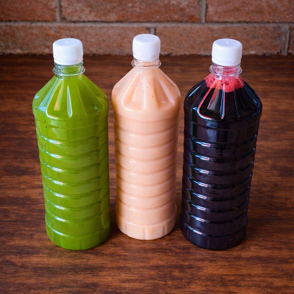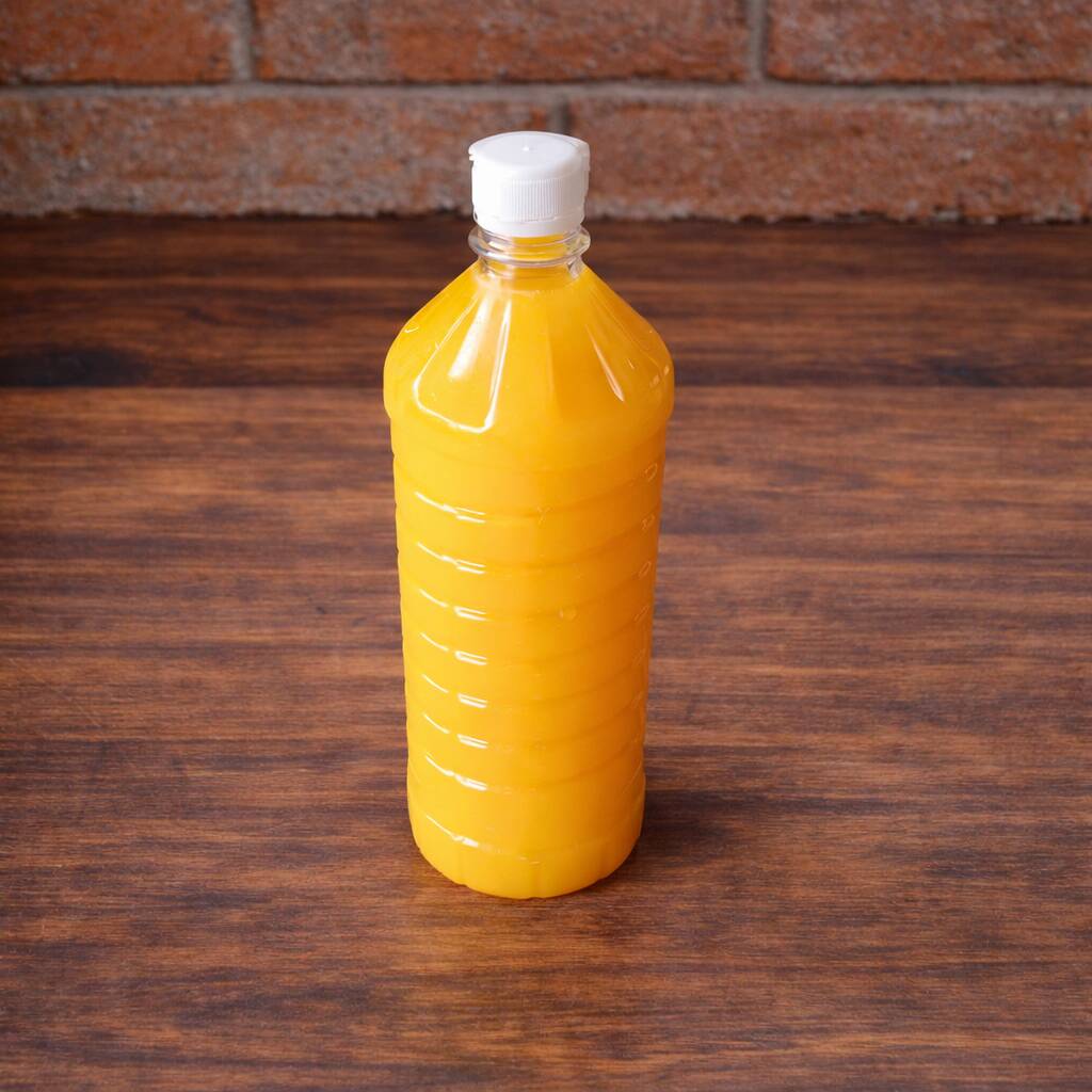 1 litro de jugo de naranja recién hecho, embotellado y listo para que lo disfrutes en donde quieras.