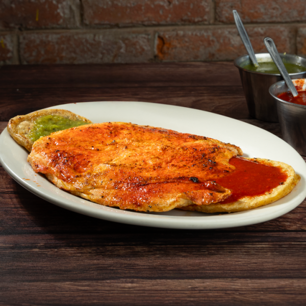 Una base de masa de maíz rellena de frijol, acompañado con una pechuga de pollo de 200 g, sazonada con nuestro condimento especial, junto con tu salsa preferida, escoge entre verde, roja o campechana