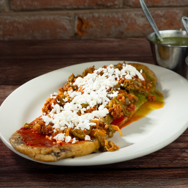 Una base de masa de maíz rellena de frijol, acompañado con un guiso exquisito de longaniza y nopales, con un toque de queso fresco, junto con tu salsa preferida, escoge entre verde, roja o campechana