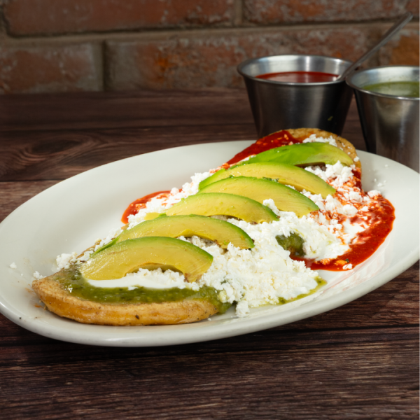 Una base de masa de maíz rellena de frijol, acompañado con crema espesa, queso fresco y rebanadas de aguacate del huerto, junto con tu salsa preferida, escoge entre verde, roja o campechana