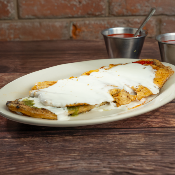 Una base de masa de maíz rellena de frijol, acompañado con 200g de una pechuga de pollo perfectamente marinada y una tira de crema espesa, junto con tu salsa preferida, escoge entre verde, roja o campechana
