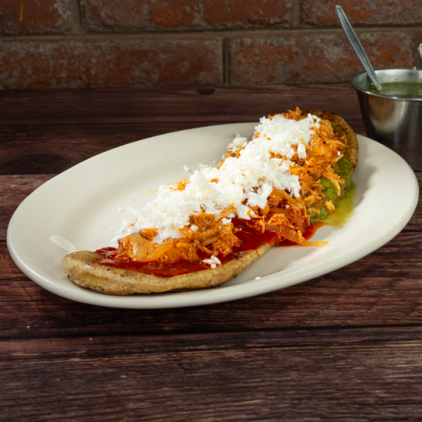 Una base de masa de maíz rellena de frijol, acompañado con nuestro sazón de tinga de pollo al chipotle, crema espesa y queso rallado, junto con tu salsa preferida, escoge entre verde, roja o campechana
