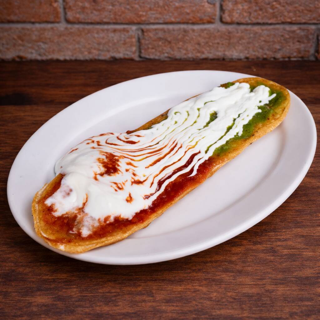 Una base de masa de maíz rellena de frijol, acompañado únicamente de 100 gramos de crema ácida y tu salsa preferida, escoge entre verde, roja o campechana