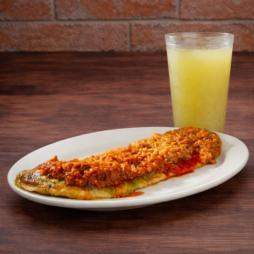 Una base de masa de maíz rellena de frijol, acompañado con una jugosa arrachera marinada de aproximadamente 200g, junto con tu salsa preferida, escoge entre verde, roja o campechana