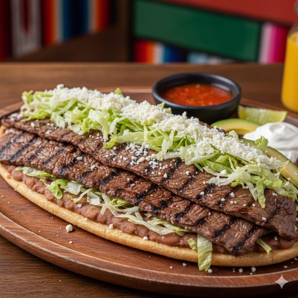 Porcion personal: Tortilla de maíz de 30cm con frijoles, lechuga, bistec y longaniza.