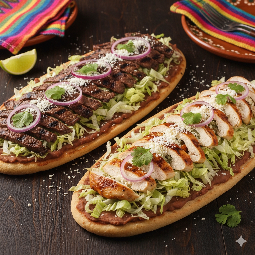 Porcion para 3 personas: Orden de 3 huaraches 30cm c/u, a elegir de pollo, bistec, pastor, arrachera, campechano salsas verde y rojas.