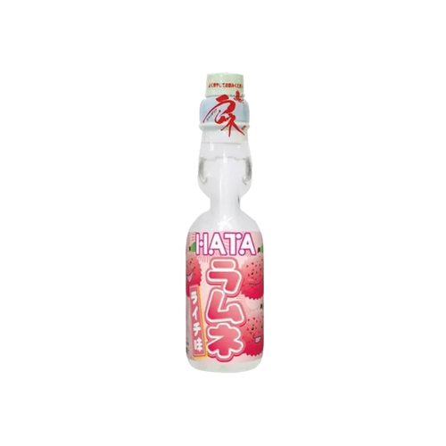 Refresco típico japonés Ramune con sabor a lychee. Ideal para disfrutar en verano, estas botellas cuentan con un diseño único que incluye un cuello con tapón de mármol de vidrio tradicional.