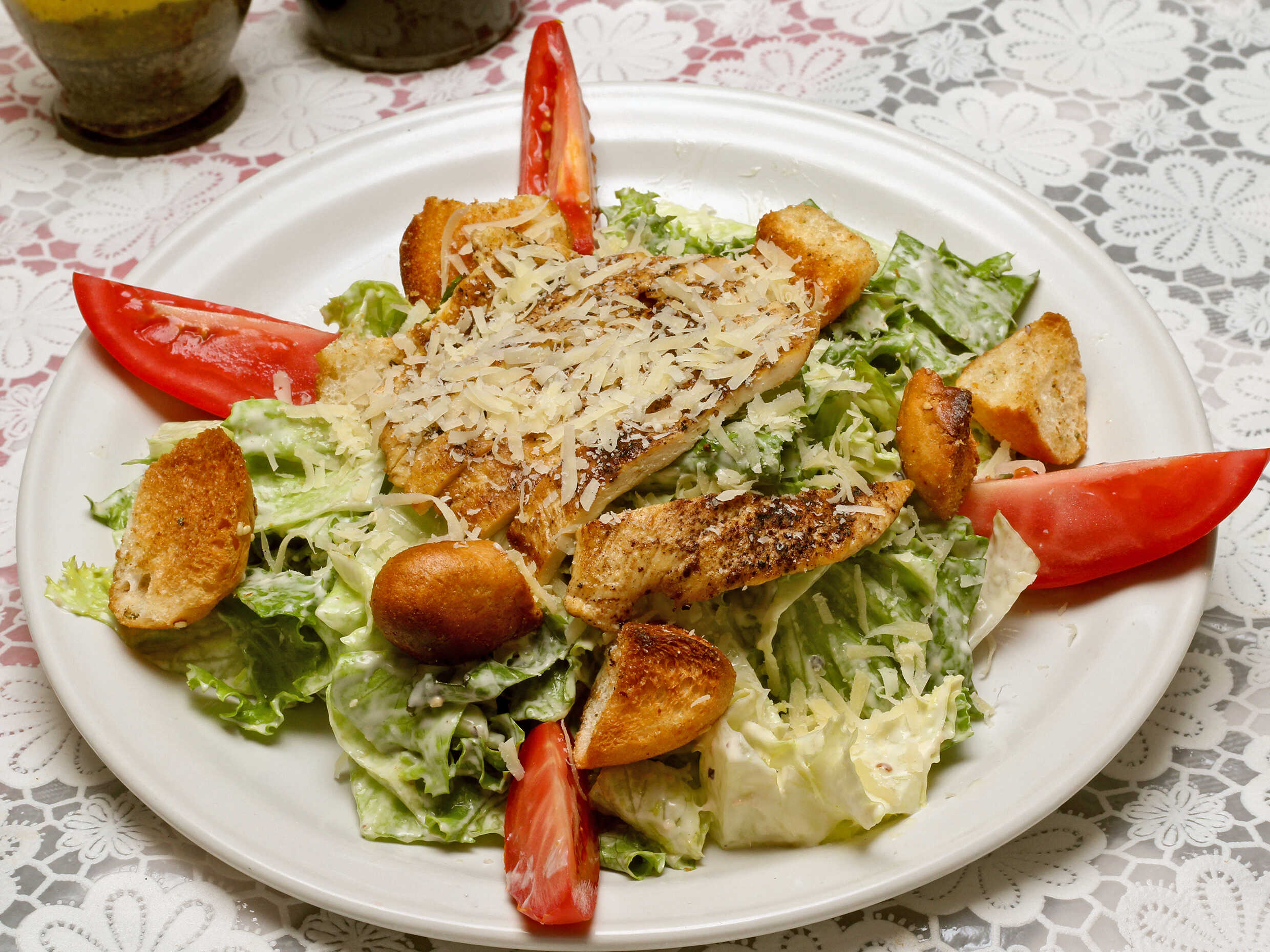 Combinación de lechugas, gajos de jitomate, pechuga de pollo a la plancha, crotones de ajo, queso parmesano, salseada con aderezo césar.