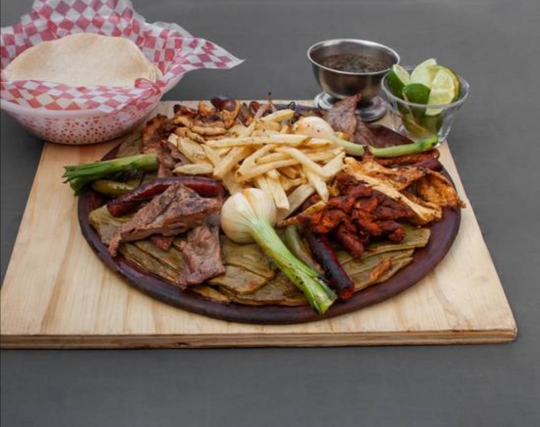 Arrachera, chistorra, carne al pastor, pechuga de pollo, papas a la francesa, nopales asados, cebolla caramelizada, chiles toreados; incluye tortillas, limones y salsa.