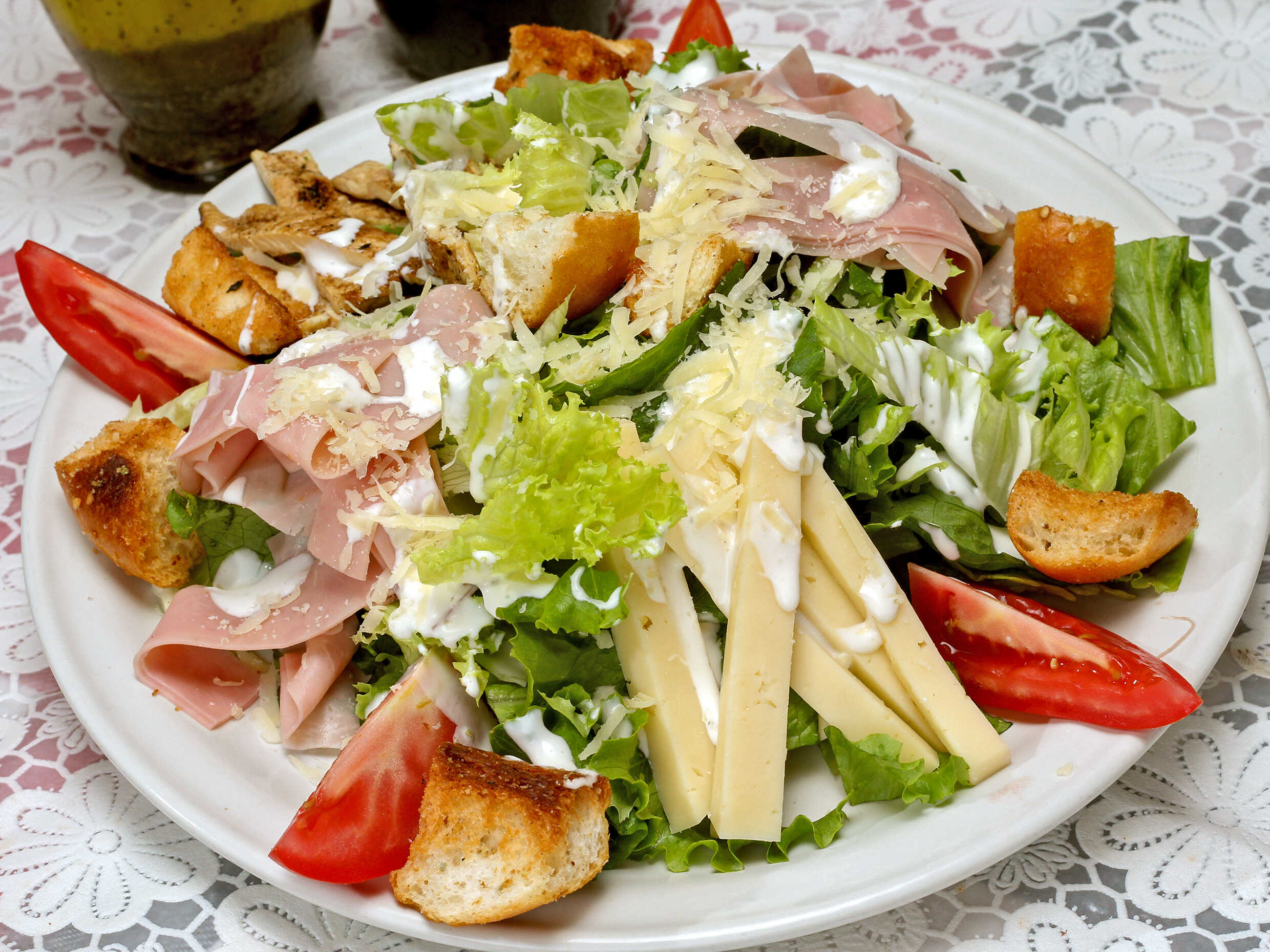 Combinación de lechugas, gajos de tomate, pechuga de pollo a la plancha, jamón, queso manchego, crotones de ajo, salseada con aderezo ranch y espolvoreado con queso parmesano.