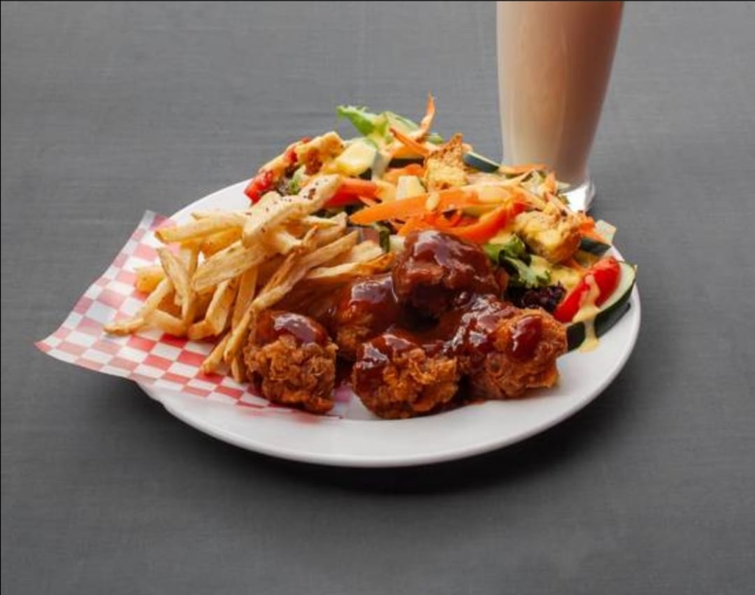 Boneless de pollo, 5 piezas, ensalada mixta con aderezo de mango, papas a la francesa, incluye refresco de lata de 355 ml.