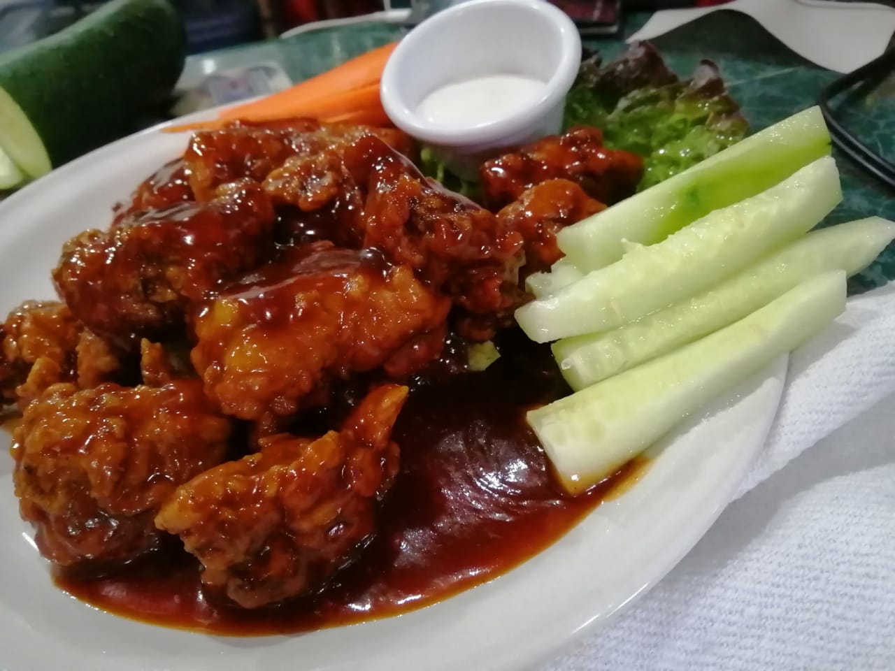 12 Piezas de pollo grandes sin hueso tipo Kentucky, bañadas en nuestras diferentes salsas. Incluye bastones de pepino y zanahoria, dip de aderezo ranch.