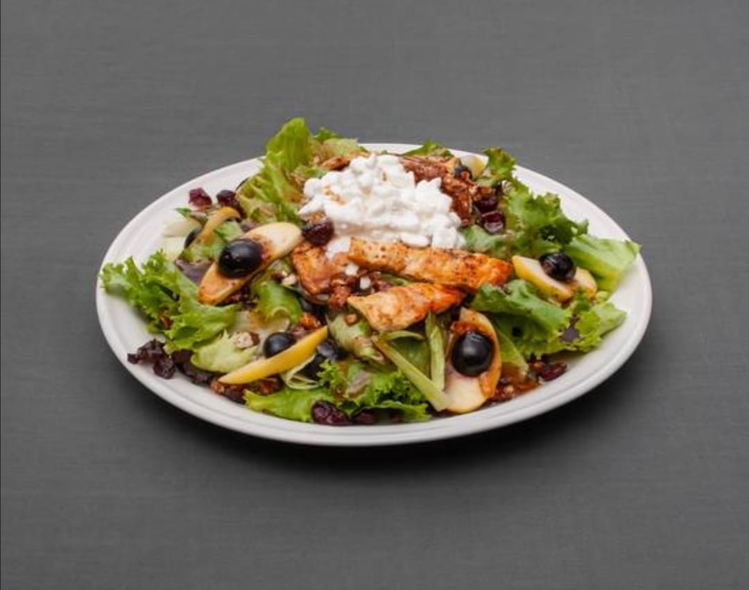 Combinación de lechugas, manzana, uvas, arándanos, nuez caramelizada, pechuga de pollo a la plancha, queso cottage, salseada con aderezo de tamarindo.