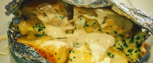 Papa rellena de jamón o tocino, salsa cremosa, gratinado con dos tipos de queso.