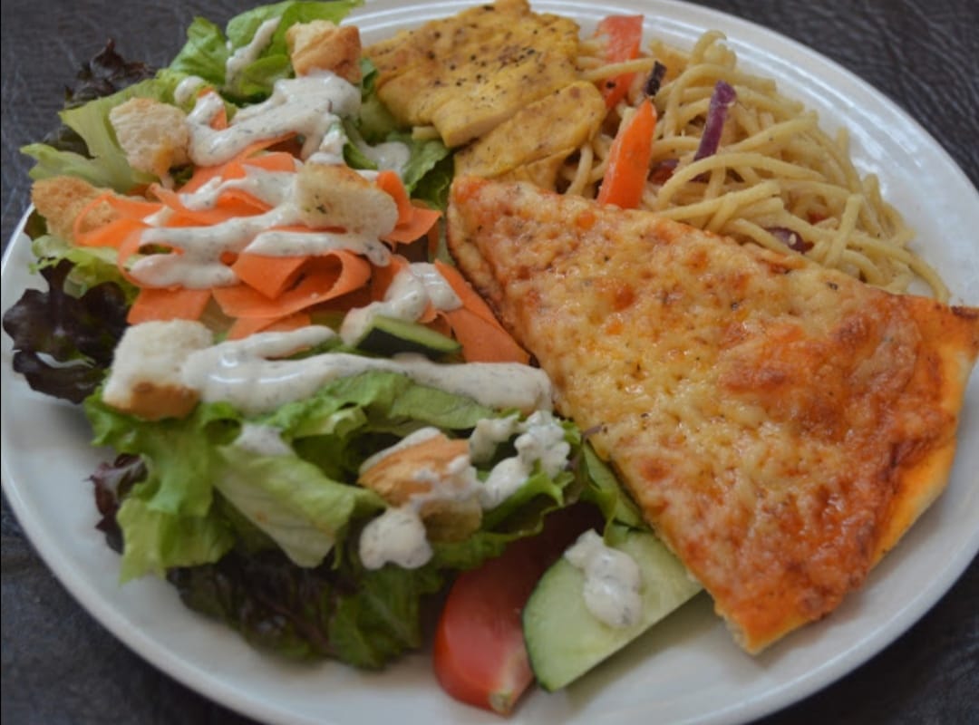 Espagueti al Tkila, ensalada a elegir, mixta o césar, pechuga de pollo a la plancha, rebanada de pizza de tres quesos, incluye refresco de lata de 355 ml.
