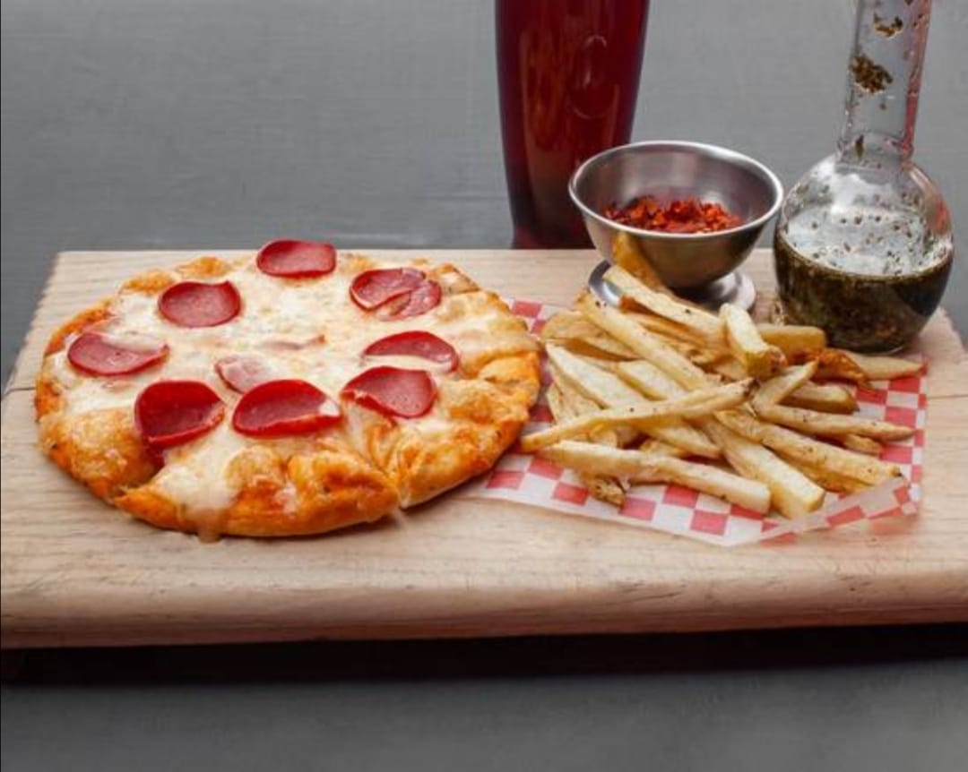 Pizza personal a elegir, pepperoni o hawaiana, acompañada con espagueti a la crema rosada o con papas a la francesa, incluye refresco de lata de 355 ml.