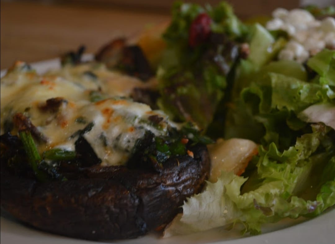 Exquisitos hongos portobello rellenos de espinacas, tocino, salsa cremosa, gratinados con queso manchego y parmesano, acompañado con ensalada waldorf.