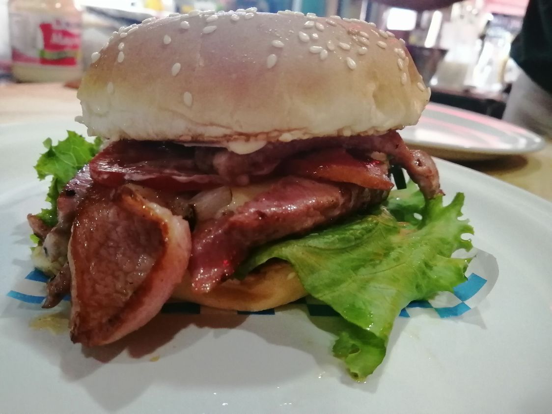 Hamburguesa de res a la plancha con tiras de tocino, piña, queso gratinado, lechuga, jitomate, cebolla caramelizada, mayonesa, cátsup, pepino o pepinillo y chile.