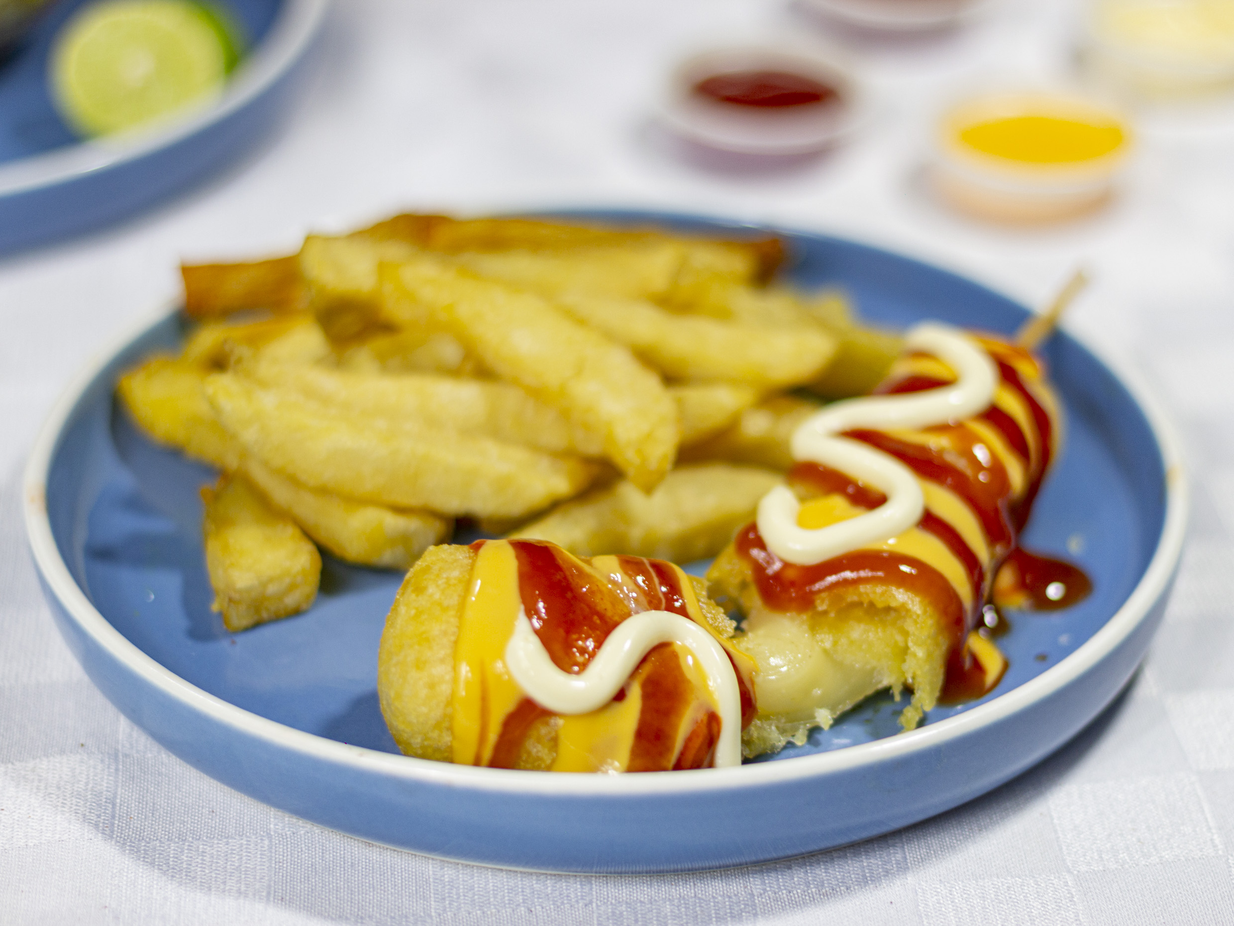 Salchicha de pavo cubierta de harina, con catsup, mayonesa, queso amarillo y salsa
