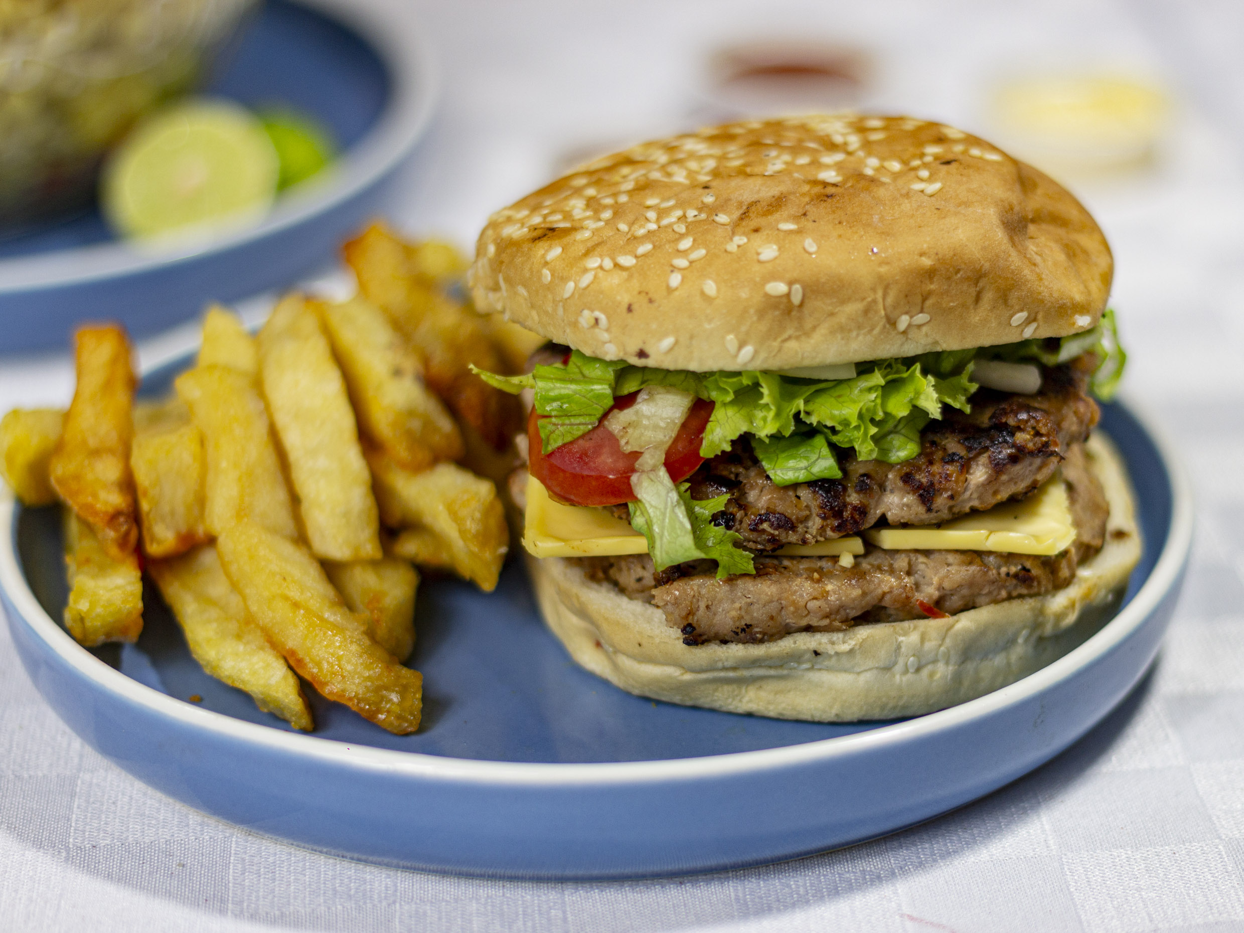 Hamburguesa de doble carne, queso amarillo , jitomate , cebolla, lechuga , catsup, mayonesa,mostaza y chiles, acompañado de papas a la francesa