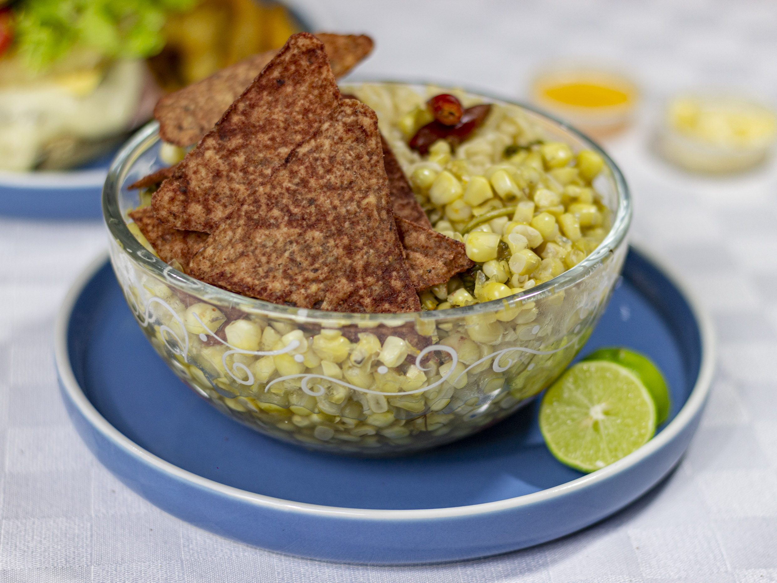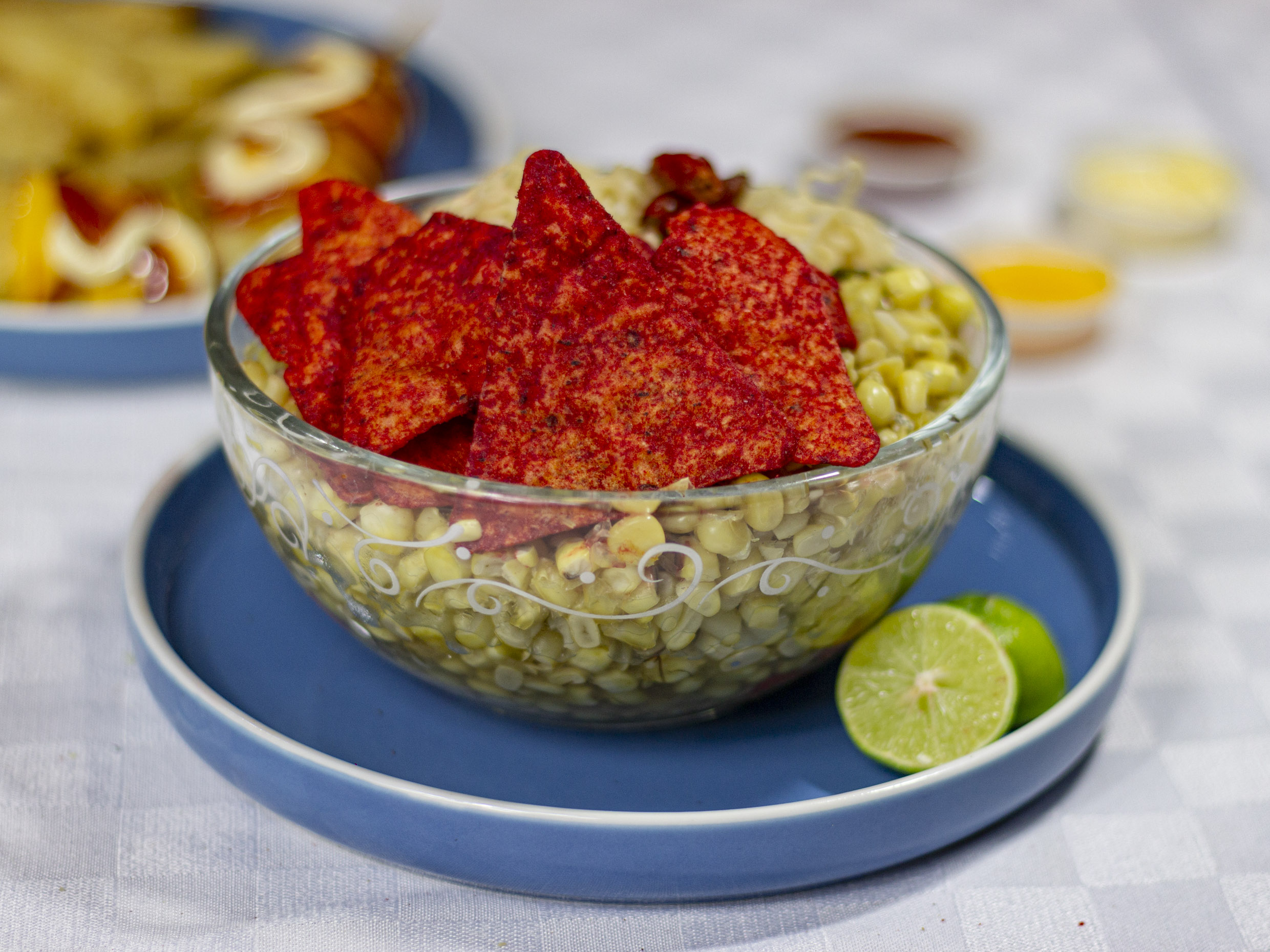 Doritos preparados con esquites, queso rallado, mayonesa, queso amarillo, limón y chile piquin