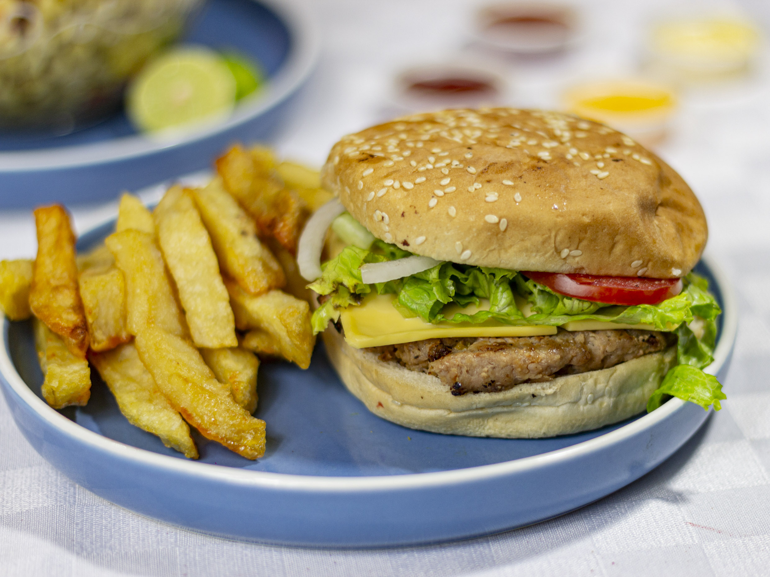 Hamburguesa de carne, queso amarillo , jitomate , cebolla, lechuga , catsup, mayonesa,mostaza y chiles, acompañada de papas a la francesa