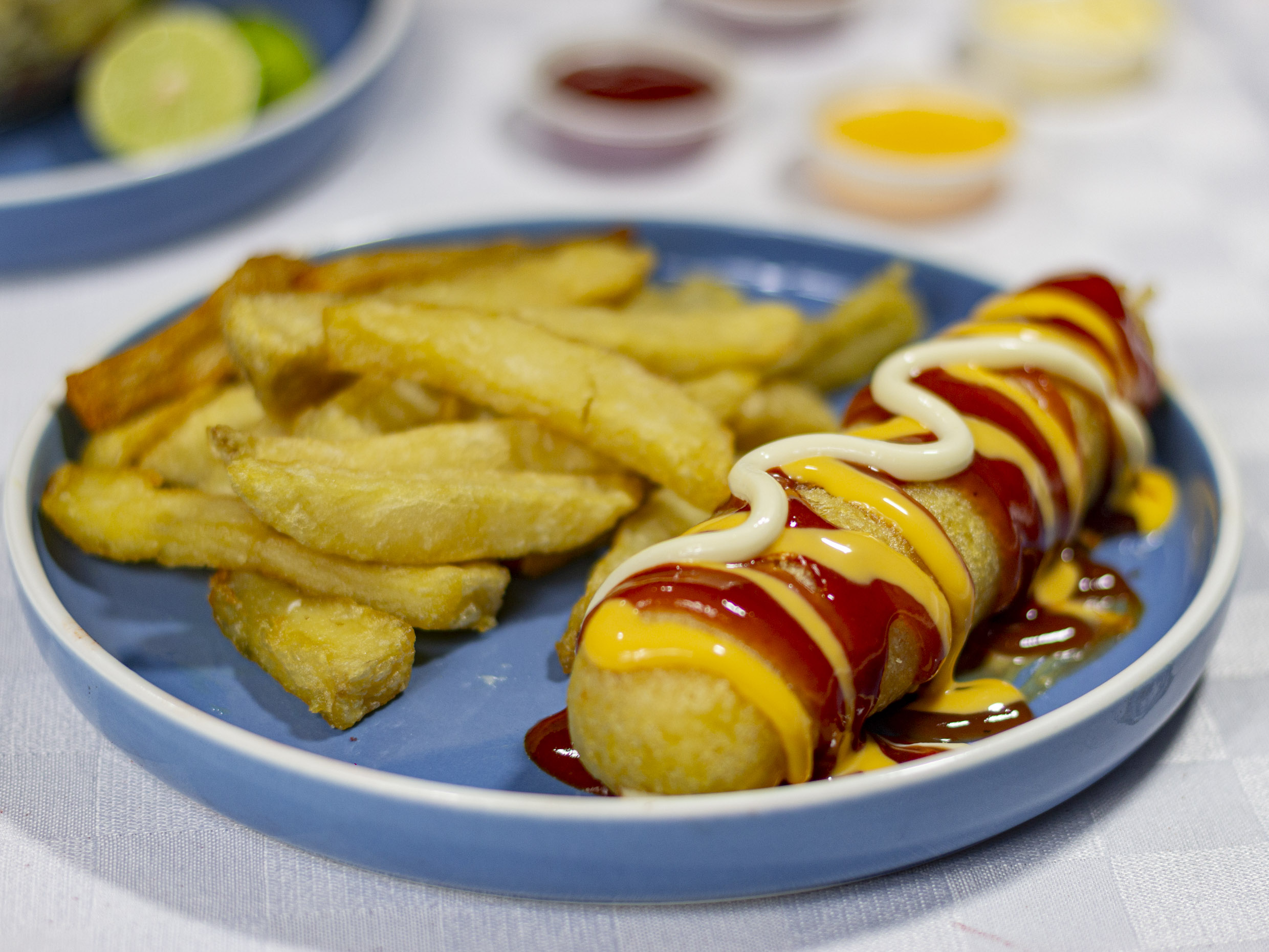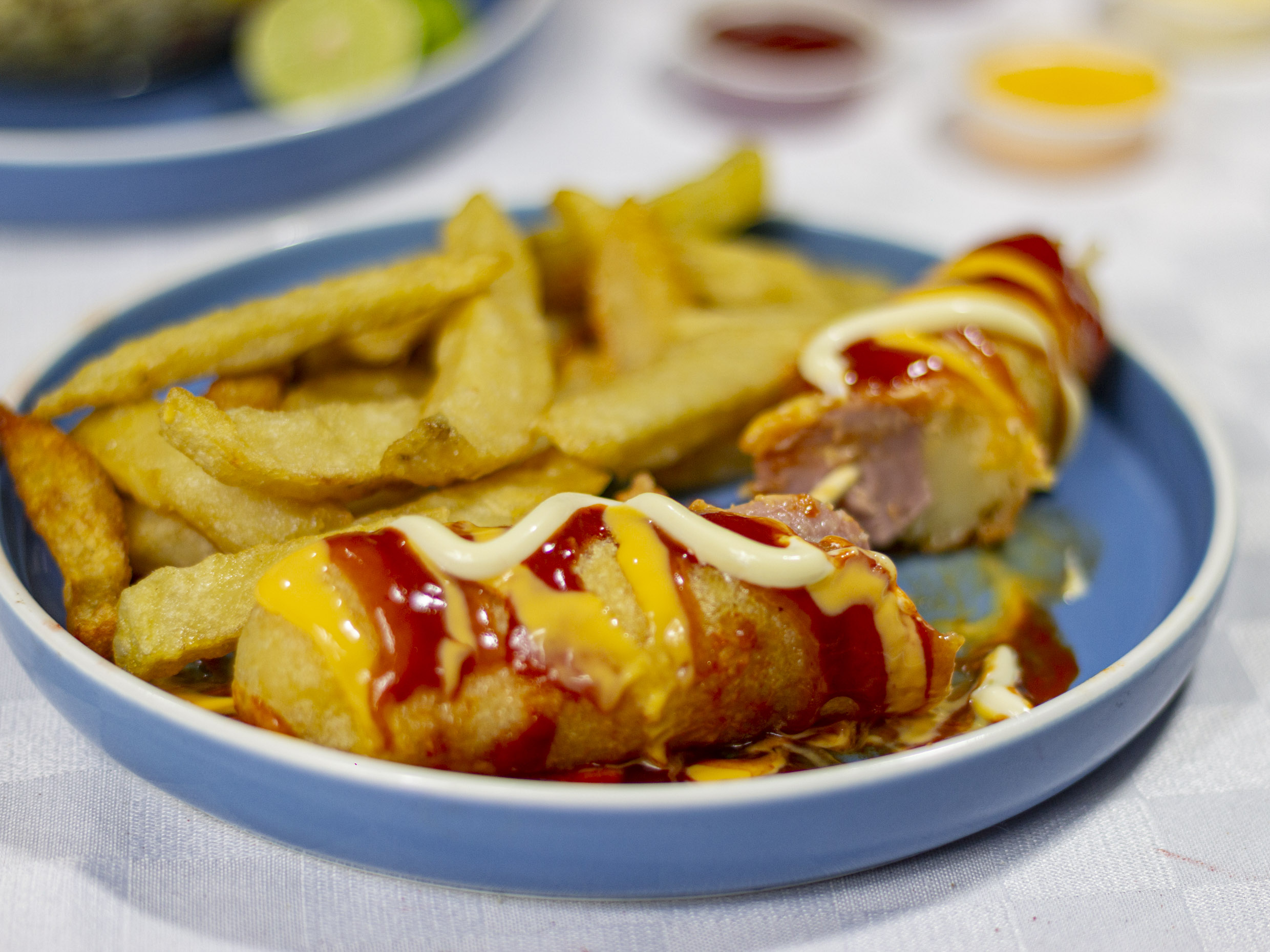 Salchicha de pavo cubierta de harina, con catsup, mayonesa, queso amarillo y salsa, acompañado de papas