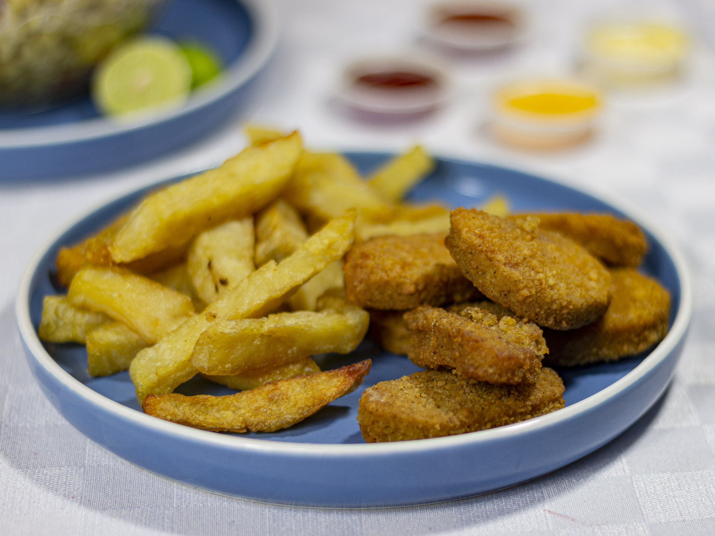 palomitas de pollo con papas ala francesa , captsu , mayonesa , queso amarillo y salsa valentina