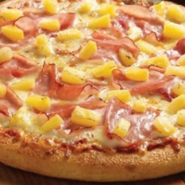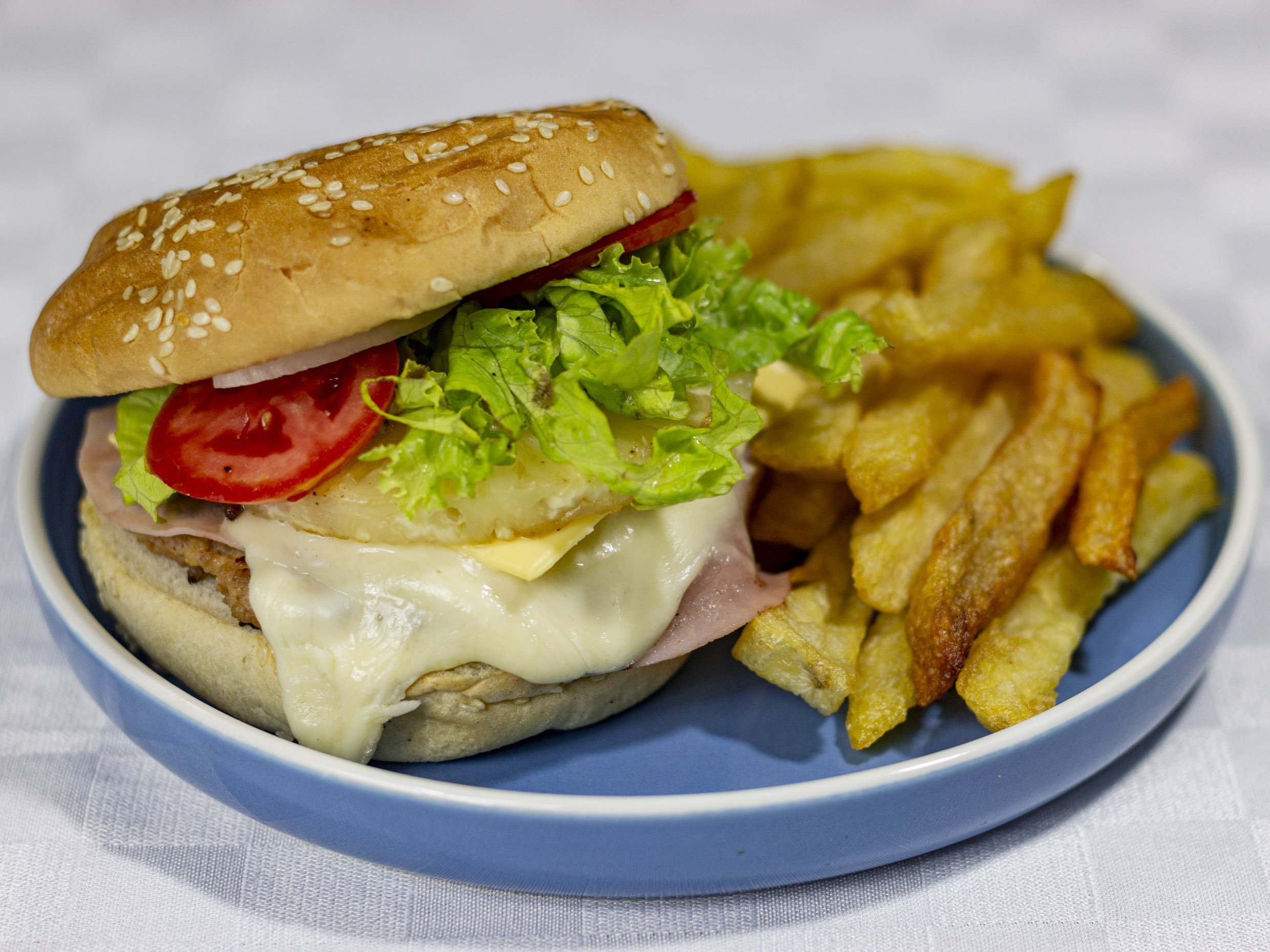 Hamburguesa de carne, queso oaxaca, piña,queso amarillo , jitomate , cebolla, lechuga , catsup, mayonesa,mostaza y chiles, acompañada de papas a la francesa