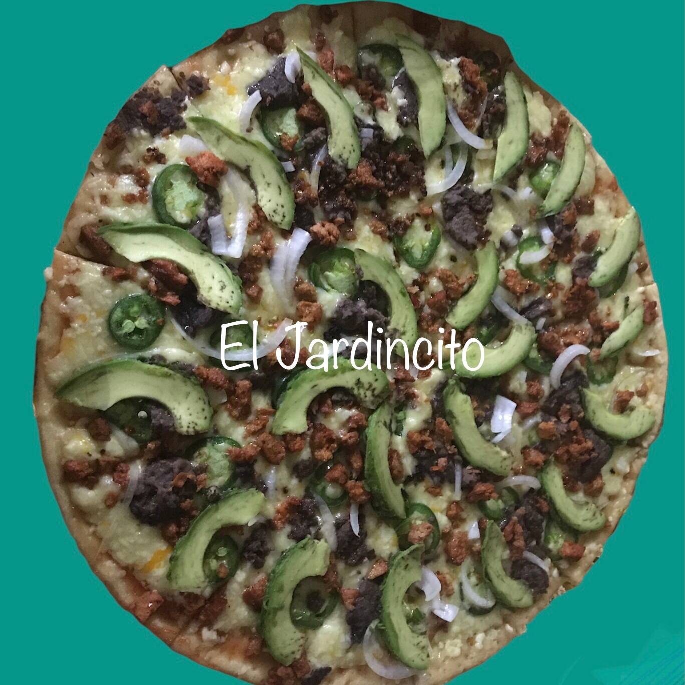 Pizza de Frijoles, chorizo, jalapeño, cebolla, aguacate y queso