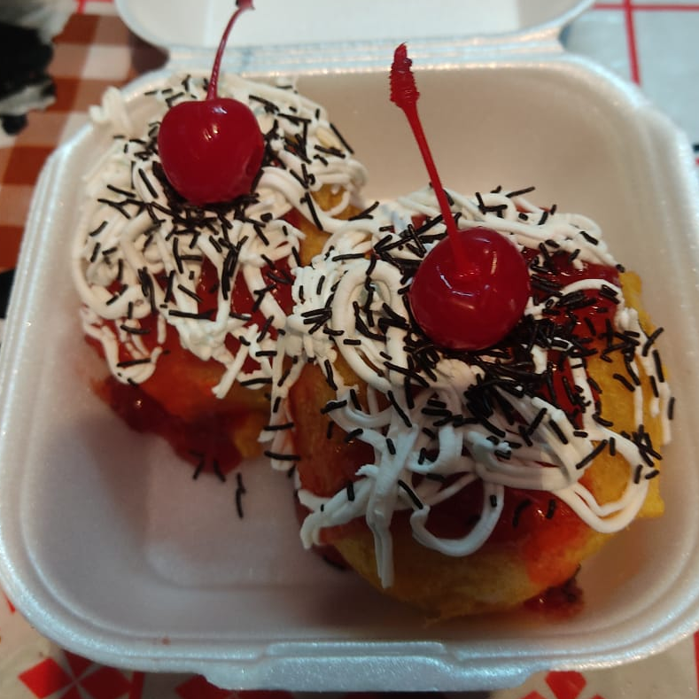 Helado capeado con harina de la casa, preparado con chantilly, mermelada, certeza y chispas de chocolate