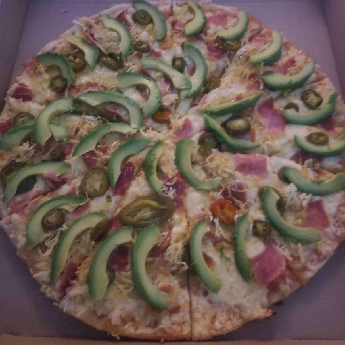 Pizza de Pierna española, pollo, aguacate, jalapeño y queso