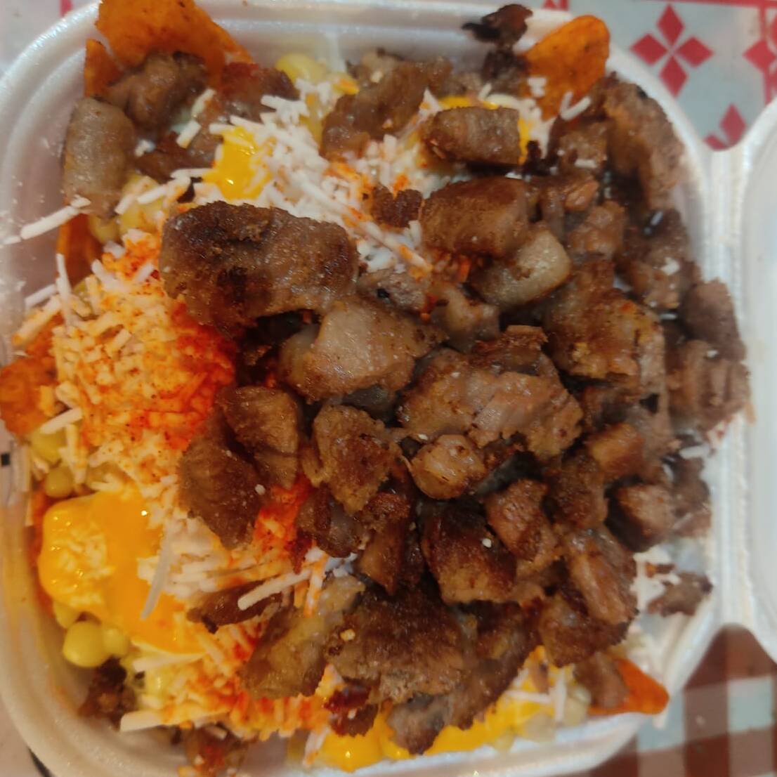 Doritos preparados con esquites, suadero, queso rallado, mayonesa, queso amarillo, limón y chile piquin