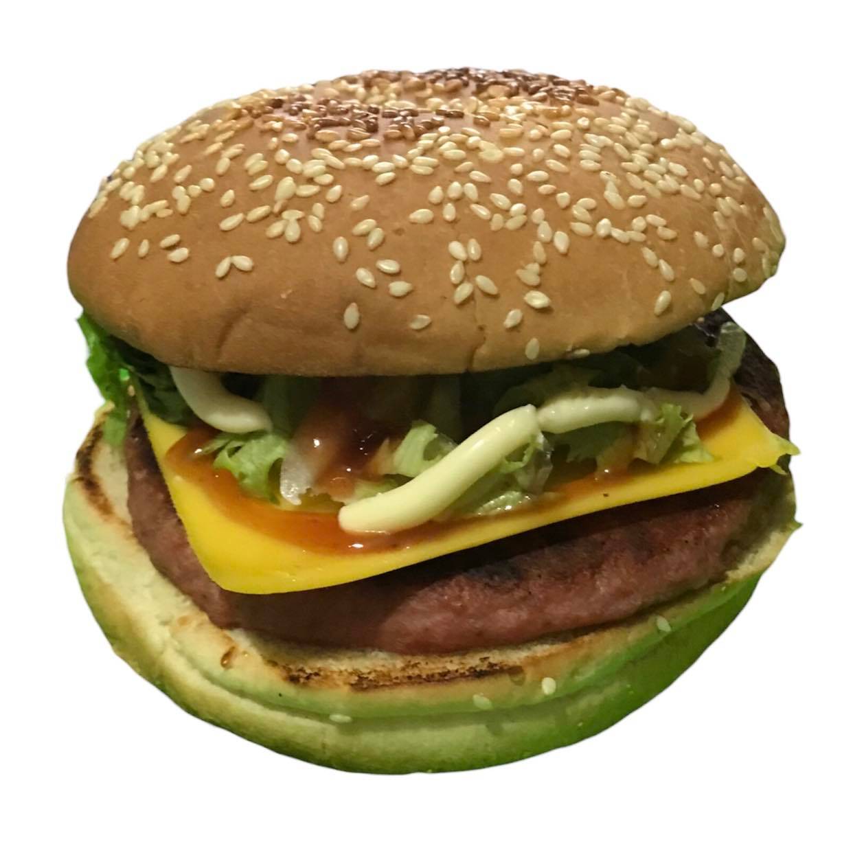 hamburguesa de pollo con queso amarillo, lechuga, jitomate, cebolla, chiles, catsup, mostza y mayonesa.