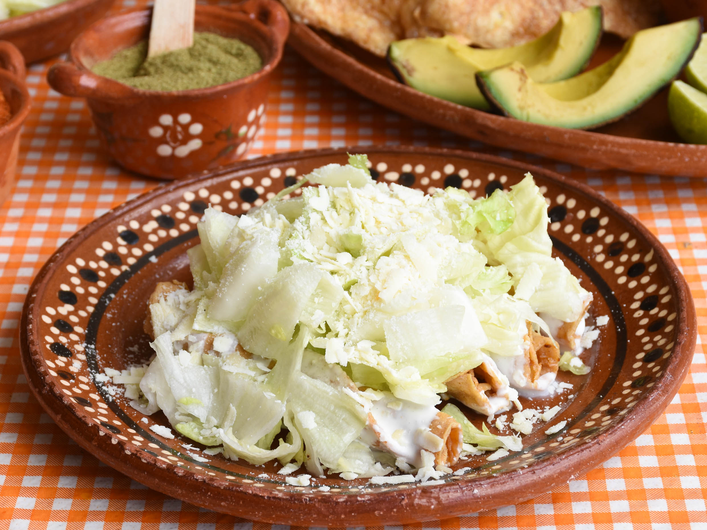 Tacos dorados 4 piezas, servidos aparte con lechuga, crema y queso.