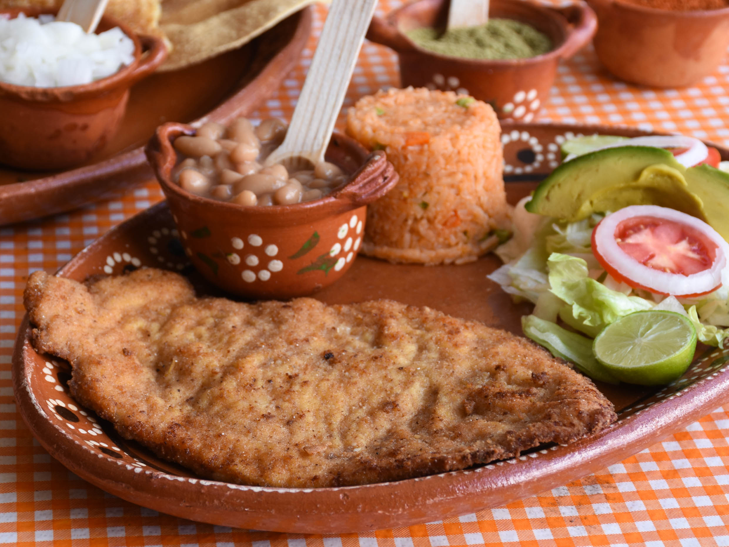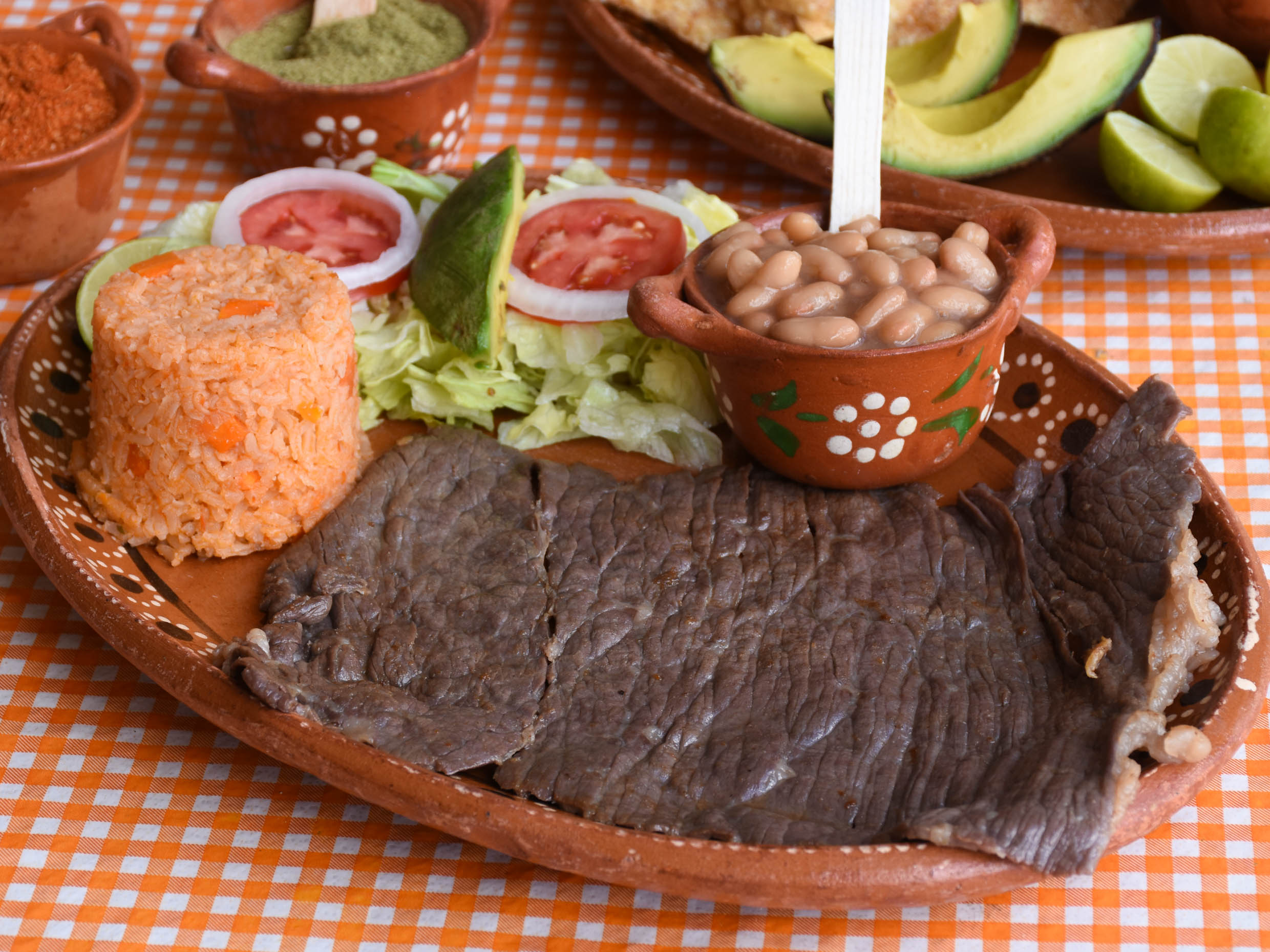 Una cecina con arroz, frijoles, ensalada, tortillas y salsas de casa. (Porción personal)