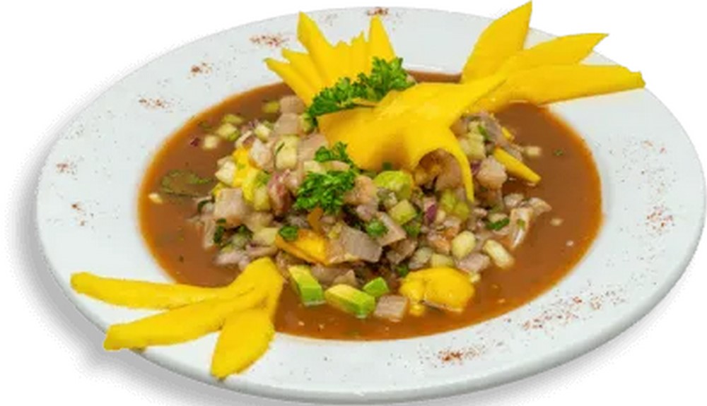 Pescado, mango, aguacate, pepino, cebolla, chile serrano, cilantro, sal, pimienta y jugo de limón, con su toque de la casa.