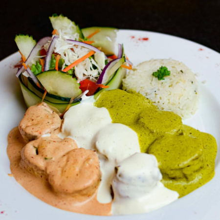 Rellenos de queso doble crema, espinaca, morrón y calabaza, envueltos en tocino y bañados en tres salsas: mochis, chipotle y bacanora. Arroz blanco y verduras al vapor como guarnición.