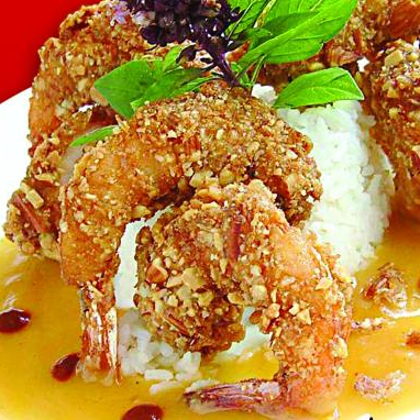 Camarones empanizados con almendra, servidos en un espejo de salsa agridulce a base de tamarindo y chile de árbol, con guarnición de puré de papa. Arroz blanco y verduras al vapor como guarnición.