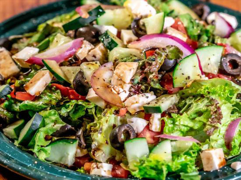 Ensalada de lechuga, aceitunas negras, queso panela, pepino, cebolla morada, sal, pimienta, aceite de oliva y vinagre balsámico.