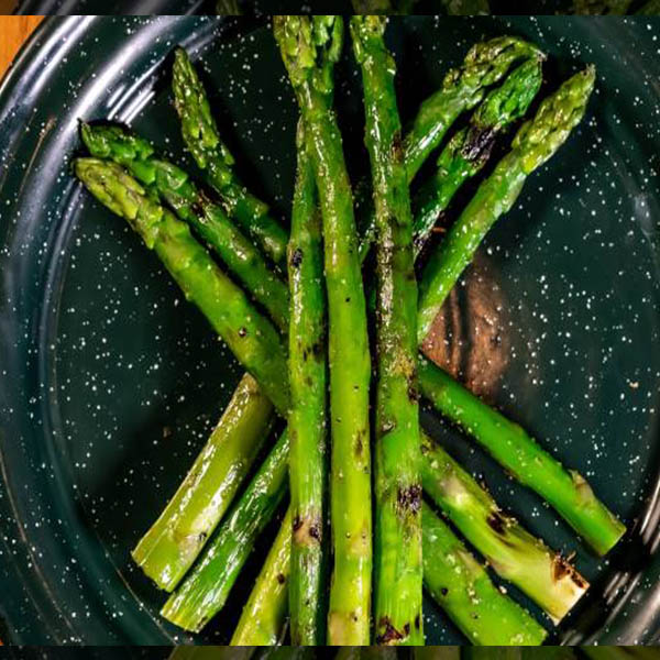 Espárragos blanqueados y después salteados a la plancha; sazonados con aceite de oliva y sal/pimienta.