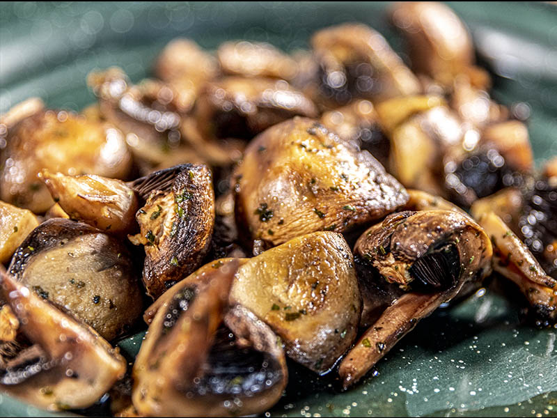 Champiñones salteados en la plancha, cocinados con aceite de oliva, sal, pimienta y perejil.