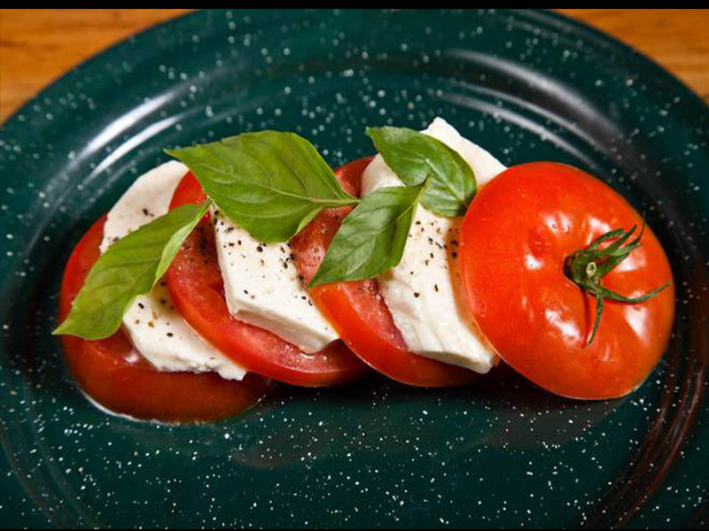 Ensalada con rodajas de jitomate, bola y queso panela aderezados con aceite de oliva, sal pimienta y albahaca.