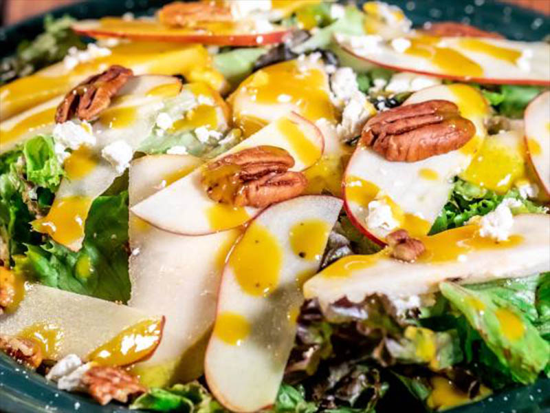 Ensalada Queso de cabra: Lechuga, pera, manzana, queso de cabra y nuez; bañada con aderezo de miel y mostaza.
