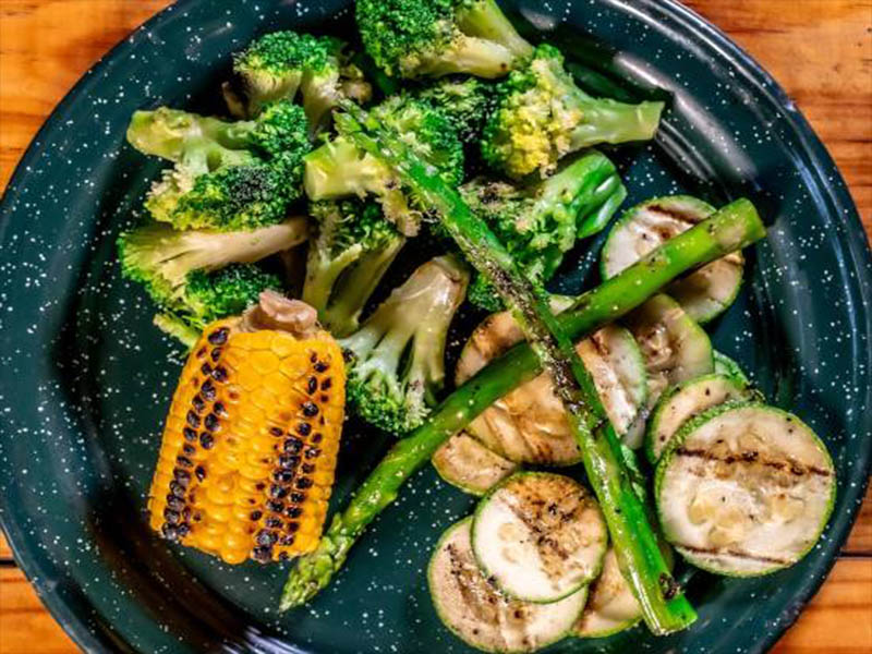 Verduras a la parrilla, espárragos, elote, calabaza y floretes de brócoli.