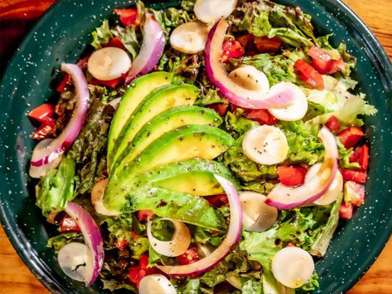 Ensalada de lechuga, jitomate, aguacate, palmito, cebolla morada, sal, pimienta, aceite de oliva y vinagre balsámico.